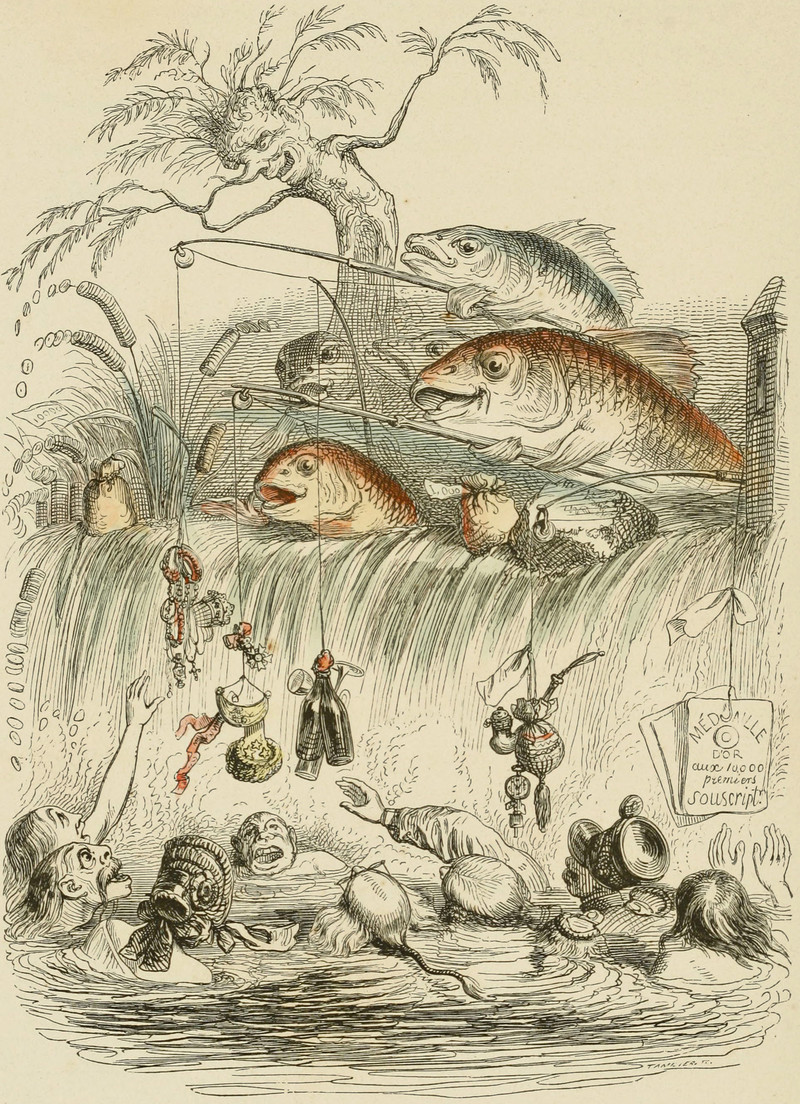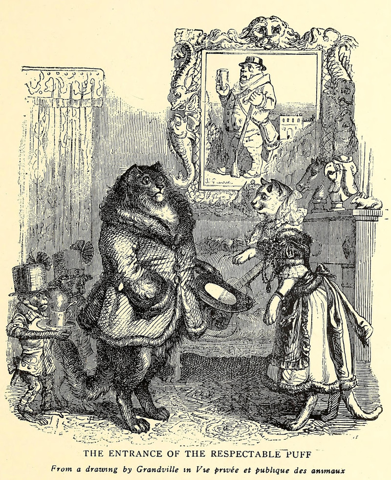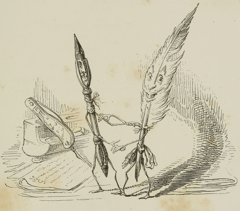 Even rarer than bird-headed scribes: just try to find a writing pillow anymore! We just did a web search for “writing pillow,” and all we saw were pillows with written words printed onto them as part of their design. We also seached “writer’s pillow,” with even fewer results. No wonder so much of what we read anymore is uncomfortable. (Illustration by Grandville, via Nemfrog.)