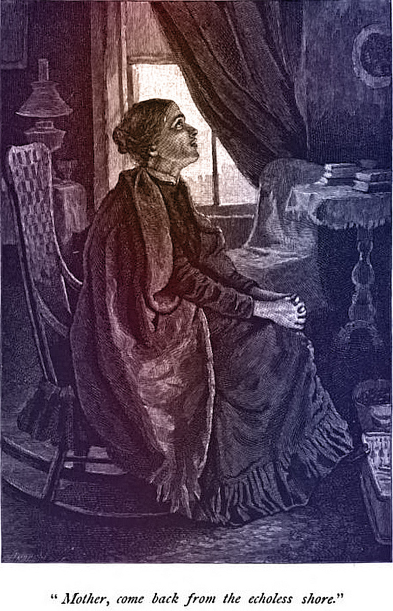 "Mother, come back from the echoless shore."  From Rock Me to Sleep, Mother by Elizabeth Akers Allen, 1883.  See Strange Prayers for Strange Times.