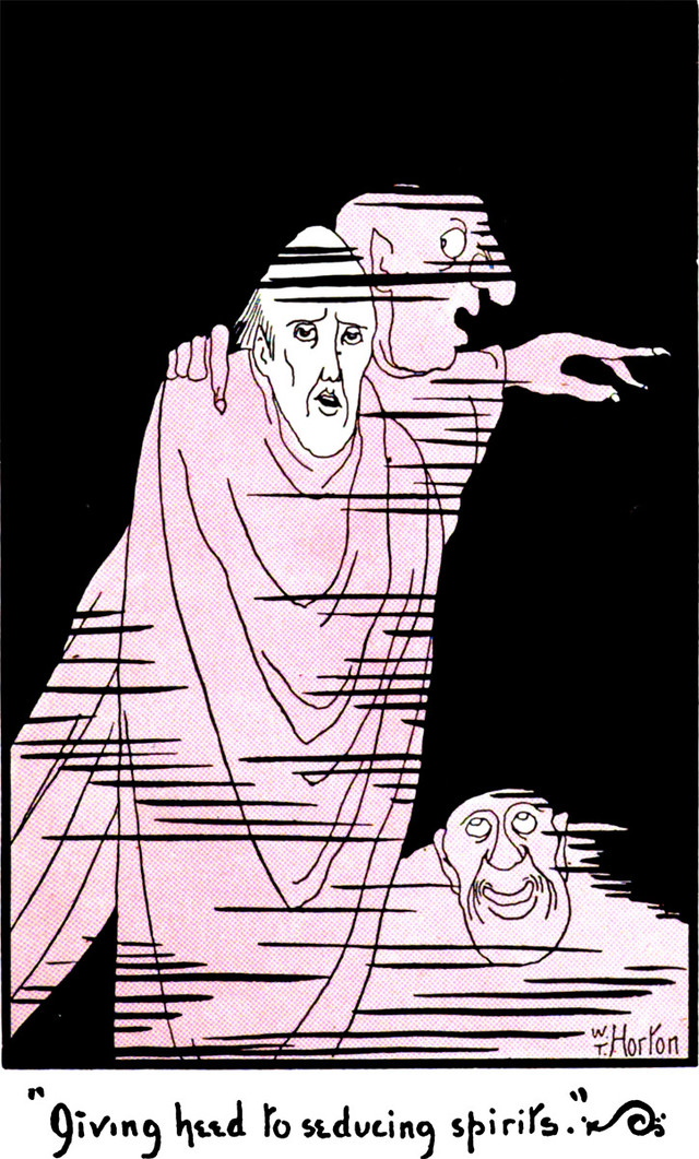An illustration from The Annals of Psychical Science, vol. 7 (1908).  The caption reads: "Giving heed to seducing spirits."