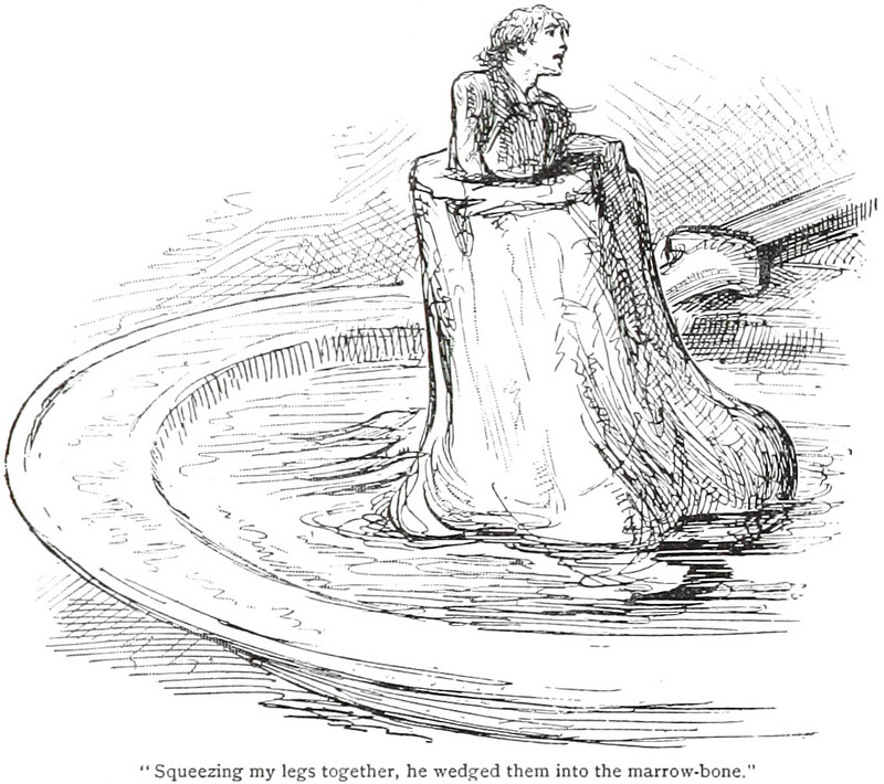 An illustration from Gulliver's Travels.  The caption reads: "Squeezing my legs together, he wedged them into the marrow-bone."