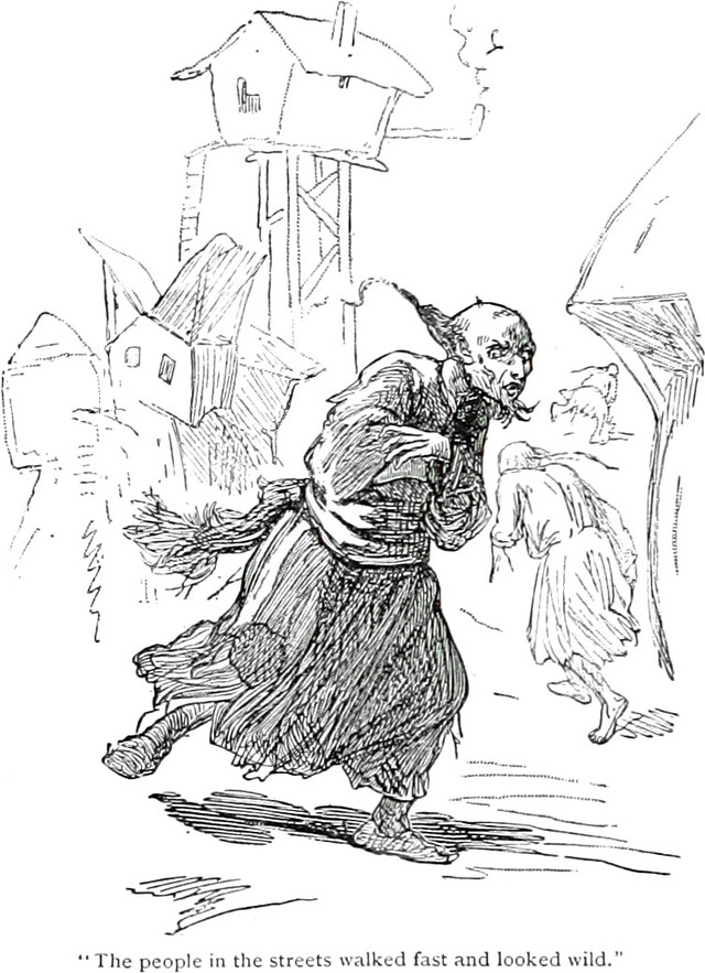An illustration from Gulliver's Travels.  The caption reads: "The people in the streets walked fast and looked wild."