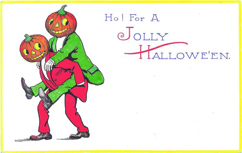 #october #jack-o'-lantern #vintage halloween #pumpkin head #vintage postcard #halloween postcard #piggy back ride #postcard