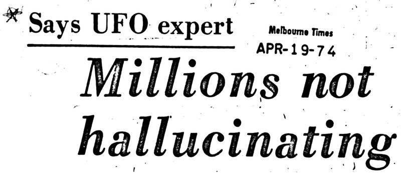 Though Buddhism would disagree, "Millions not hallucinating, says UFO expert."  From UFO Newsclipping Service, 1974.