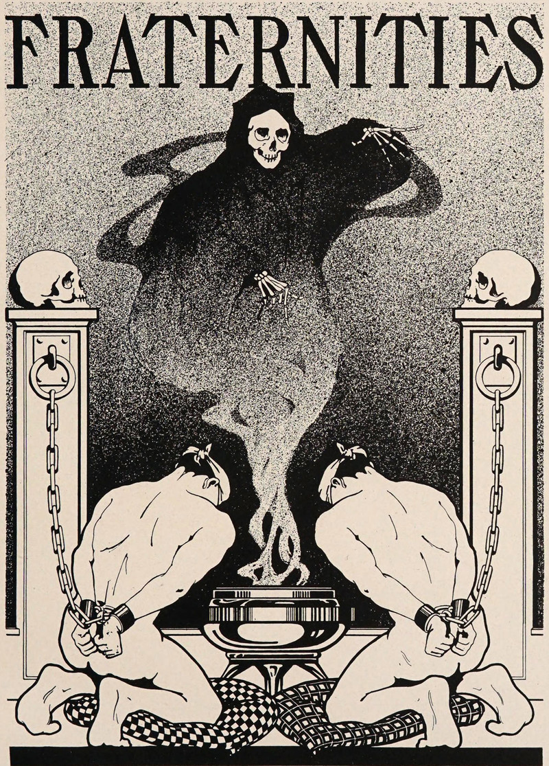#vintage illustration #skeleton #occult #fraternity #vintage yearbook #yearbook #secret society #1900s #in chains #illustration #handcuffed