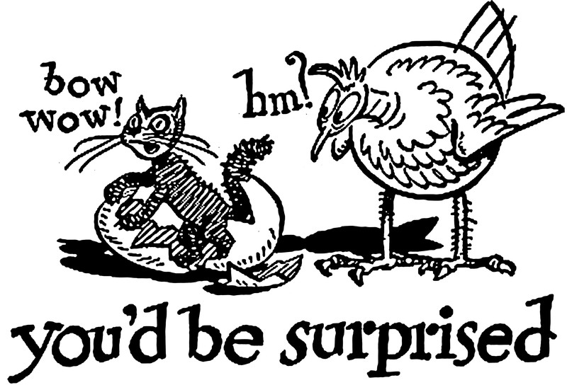 Today's barking cat hatching from an egg is from Life Magazine, 1924.  "You'd be surprised."