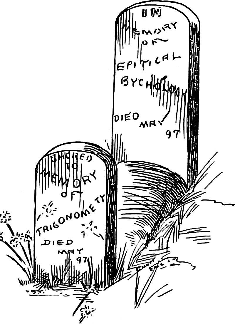 If you've never heard of Epitical Bychology [sic] or Trigonomety [sic], it may be because they both died in May, 1897. From the Agnes Scott Institute's Aurora yearbook. (For some unbelievably weird yearbook imagery, see our How to Hoodoo Hack a Yearbook.)
