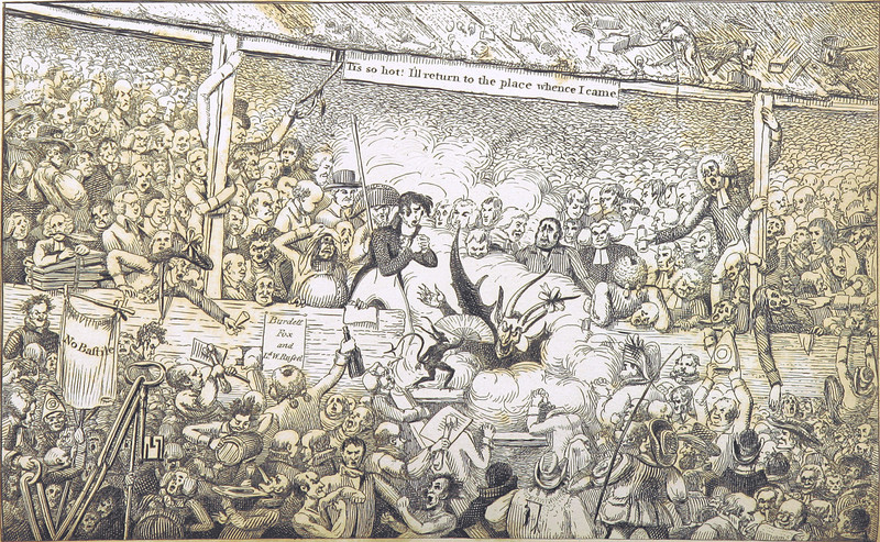 "Tis so hot!  I'll return to the place whence I came."  From The Scum Uppermost When the Middlesex Porridge-Pot Boils Over, 1802.