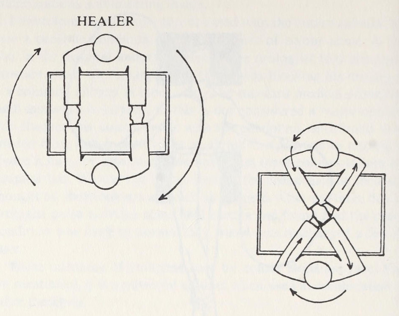 Holding hands for magnetic healing. Pictued left, two right-handers. Pictured right, "if the person is left-handed and you are right-handed, hold their right with your right and their left hand with your left as shown." From Pendulum Power by Greg Nielsen, 1987