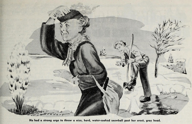"He had a strong urge to throw a nice, hard, water-soaked snowball past her erect, gray head." From Lighted Pathway, 1951. Speaking of which, what exactly are a snowball's chances in hell? See A Snowball's Chance in Hell.