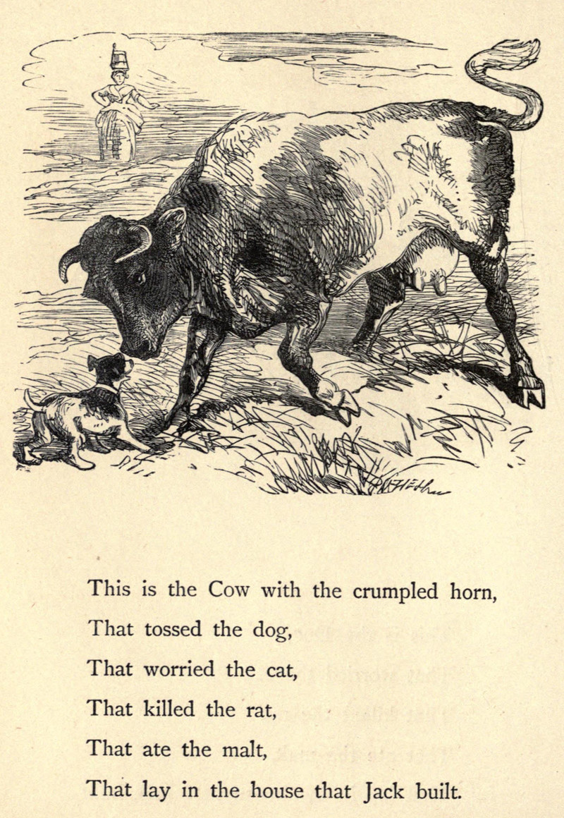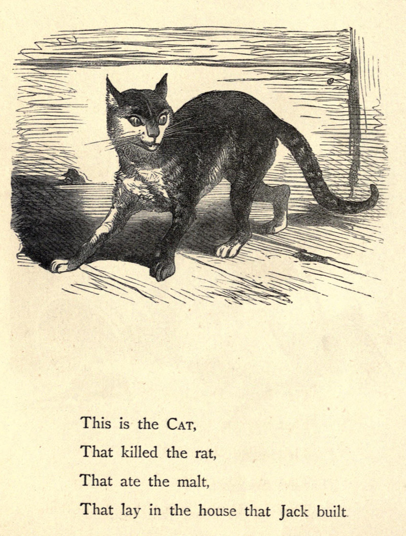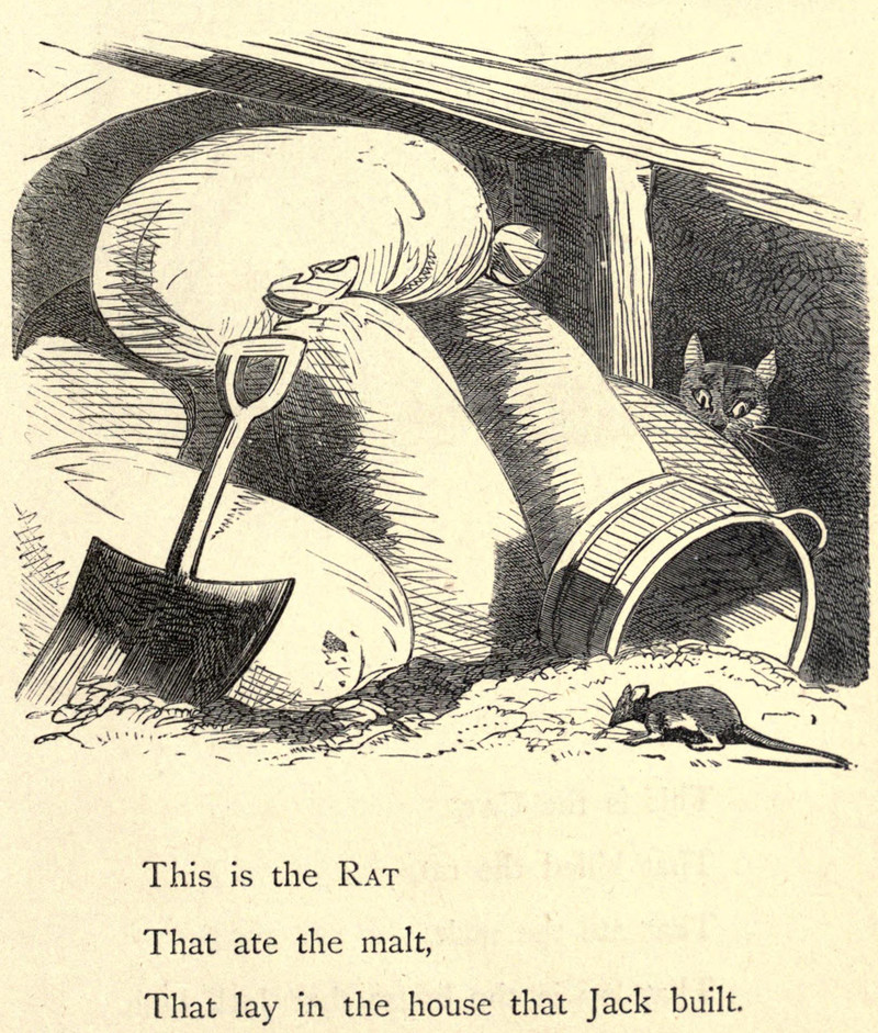 "This is the house that Jack built. Find the rat that ate the malt, the cat, the dog, the cow, the maid, the man, and the parson." From Chatterbox, 1908.