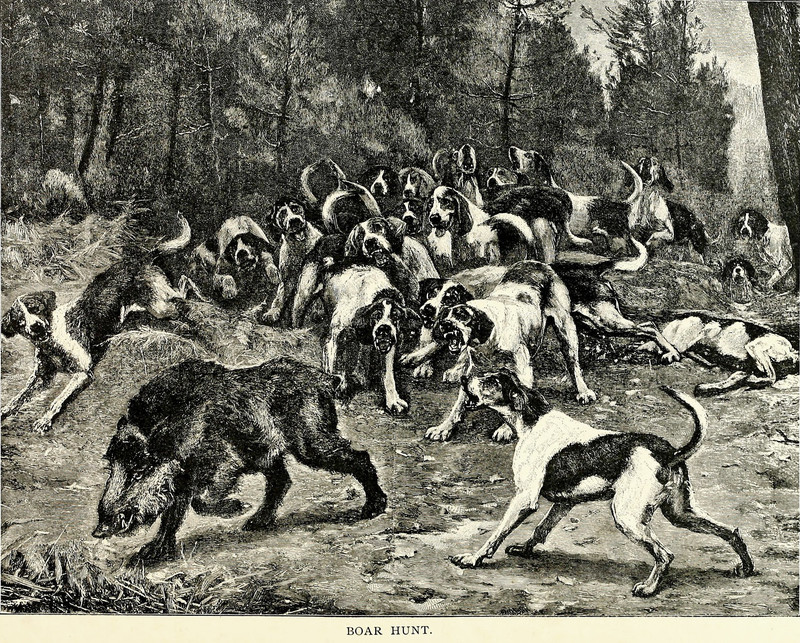 Boar versus hunting dogs: which do you wager for the win?  From All About Animals: Facts, Stories and Anecdotes, 1900.