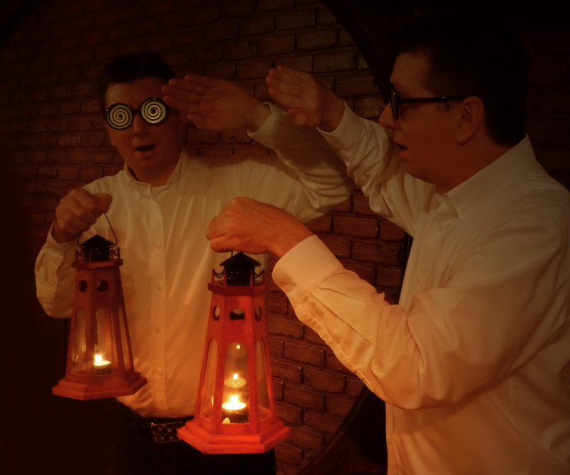 Prof. Oddfellow narrowly averts self-hypnosis.  Hypno-Glasses by Accoutrements.
