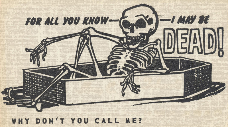 #vintage illustration #death #halloween #skeleton #october #coffin #communication #keep in touch #vintage postcard #out of touch #i may be dead #for all you know #illustration #call me #postcard