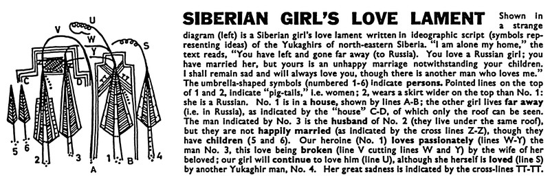 A lover's lament written in Siberian ideographic script.  From The Unesco Courier, 1963.