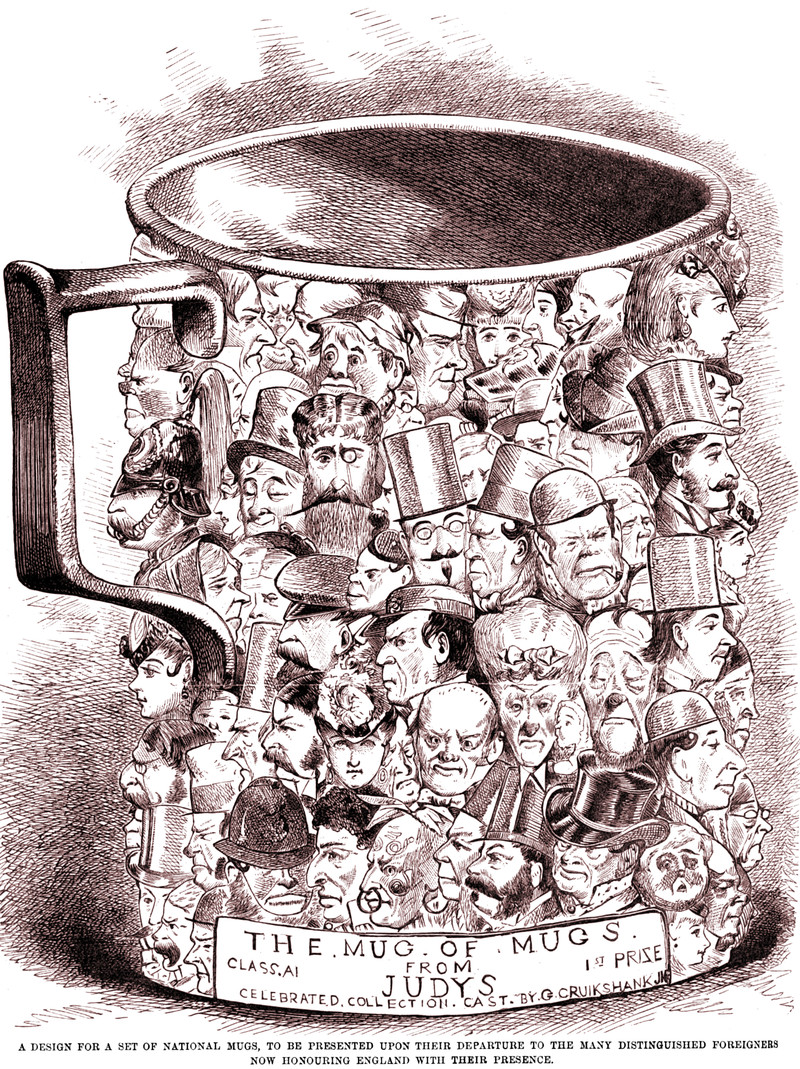 "A design for a set of national mugs, to be presented upon their depature to the many distinguished foreigners now honouring England with their presence." From Judy, Or The London Serio-Comic Journal, 1871.