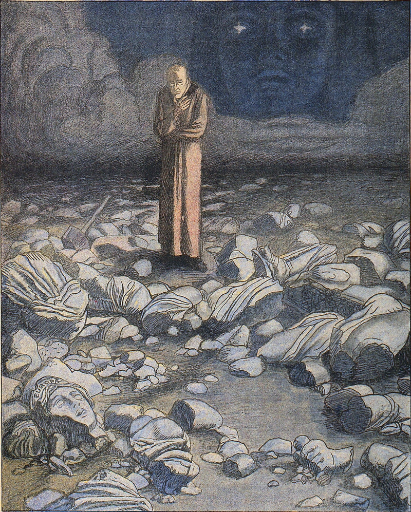 Reblog if you have stood amongst the broken statuary while the sphinx-like eyes of the night looked on.  From Lustige Blätter, 1918.