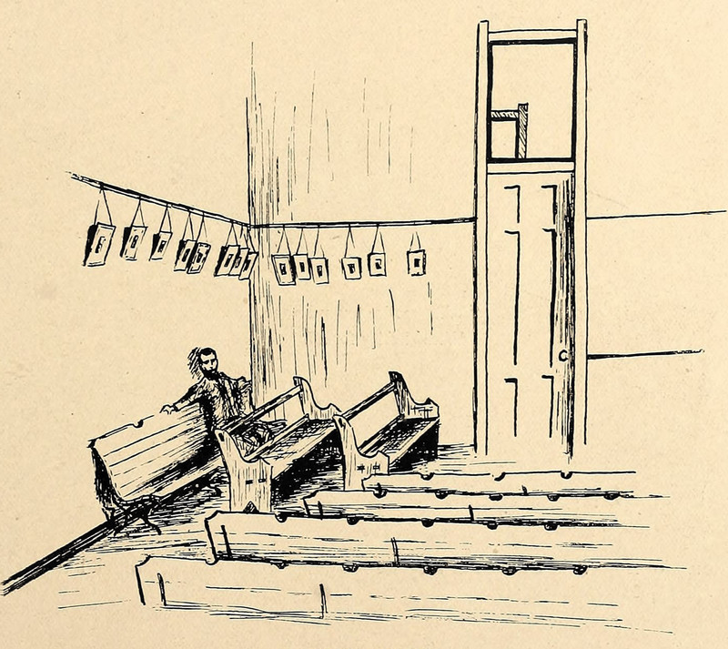 "Stood in one corner with folded arms."  From Judge's Library, 1887.