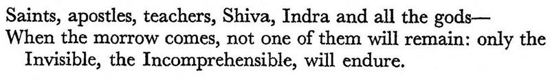 "Saints, apostles, teachers, Shiva, Indra and all the gods—when the morrow comes, not one of them will remain: only the Invisible, the Imcomprehensible, will endure." —A Sixteenth Century Mystic by W. G. Orr (1947)