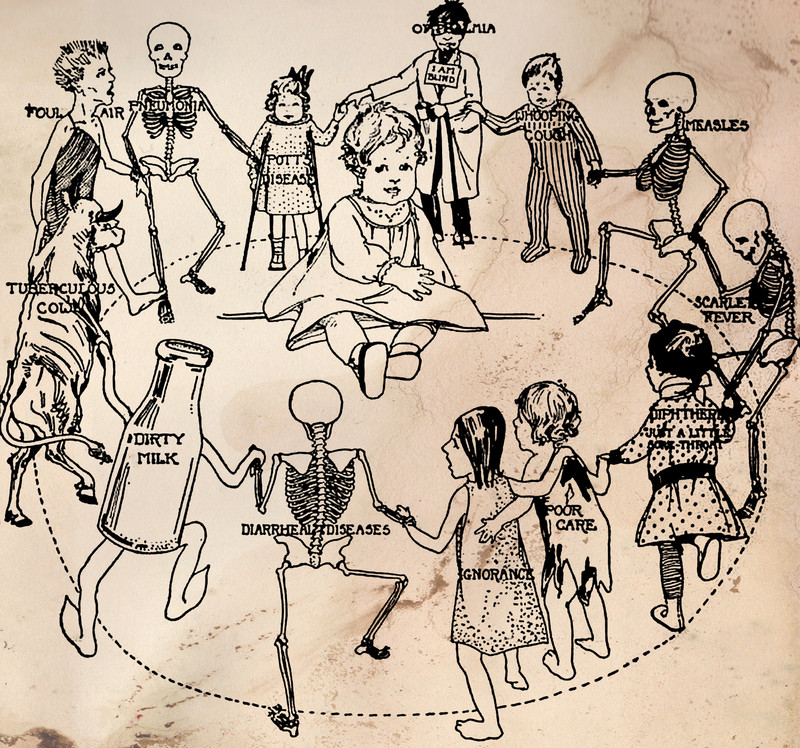 Perils dance around a child.  From the Bulletin of the Chicago School of Sanitary Instruction, 1912.