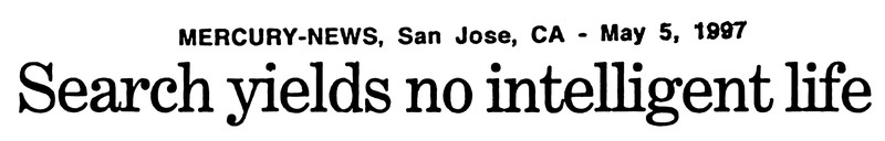 We sought to independently verify this, and we, too, had trouble finding any intelligent life anywhere.  Via UFO Newsclipping Service, 1997.