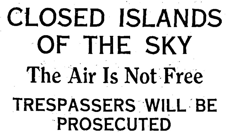 "Closed islands of the sky.  The air is not free.  Trespassers will be prosecuted."  From The Children's Newspaper1934.