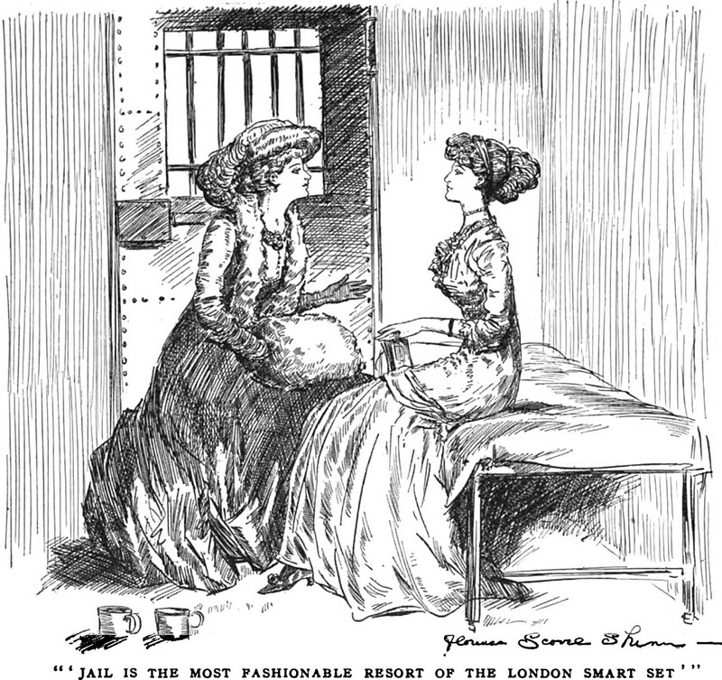 An illustration from a 1909 issue of Putnam's magazine.  The caption reads: "Jail is the most fashionable resort of the London smart set."