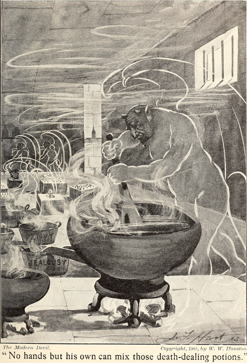 "No hands but his own can mix those death-dealing potions," from The Modern Devil by Isaiah Mench Chambers, 1903.Speaking of which, what exactly are a snowball's chances in hell? See A Snowball's Chance in Hell.