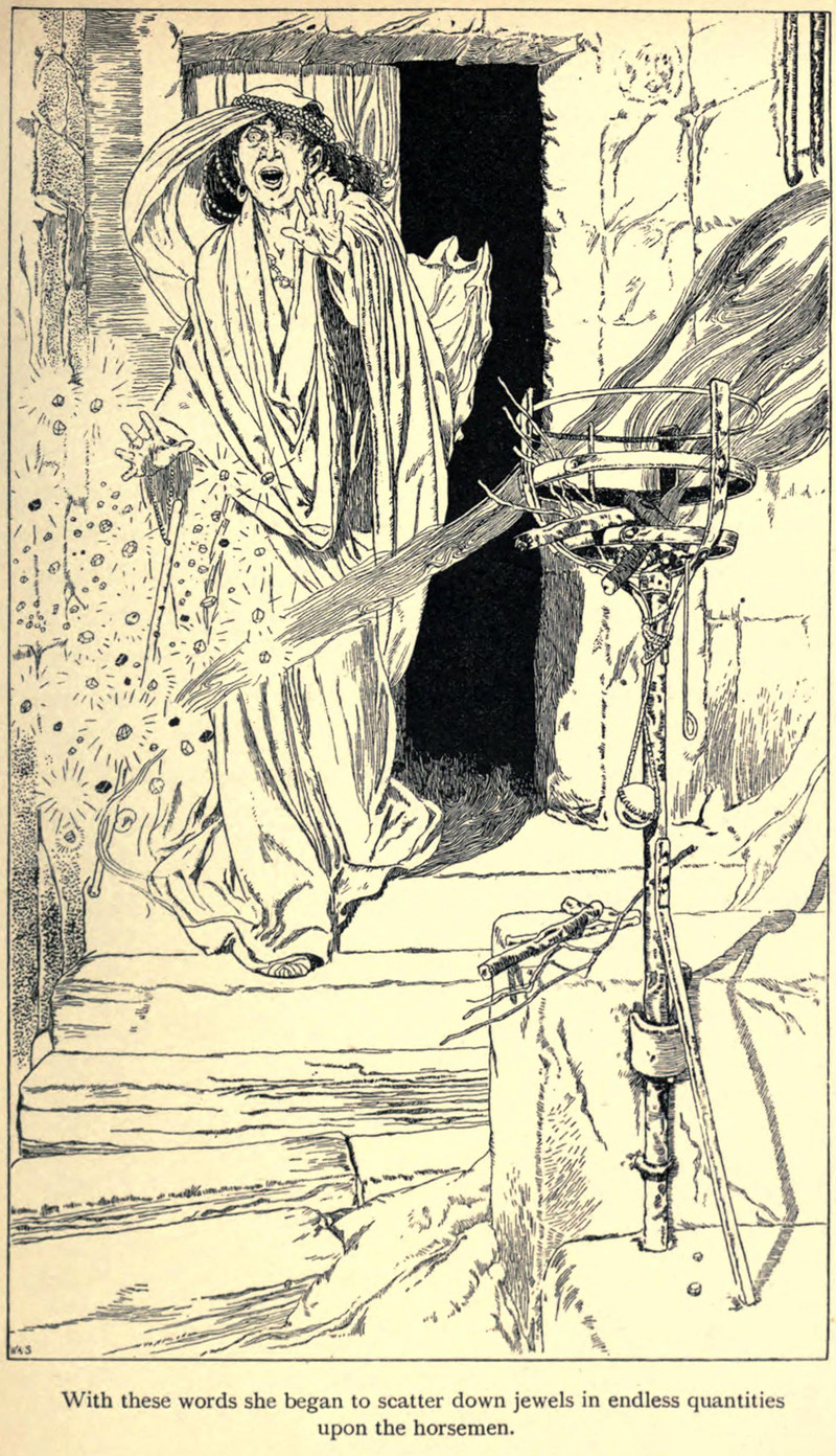 "With these words she began to scatter down jewels in endless quantities upon the horsemen." From Legends from River and Mountain by Carmen Sylva and Alma Strettell and illustrated by T. H. Robinson, 1896.