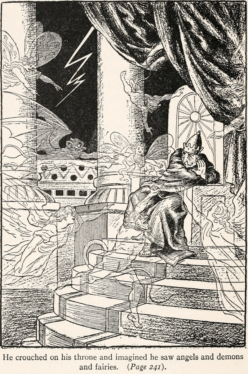 "He crouched on his throne and imagined he saw angels and demons and fairies."  From Jewish Fairy Tales and Legends by Gertrude Landa, 1919.