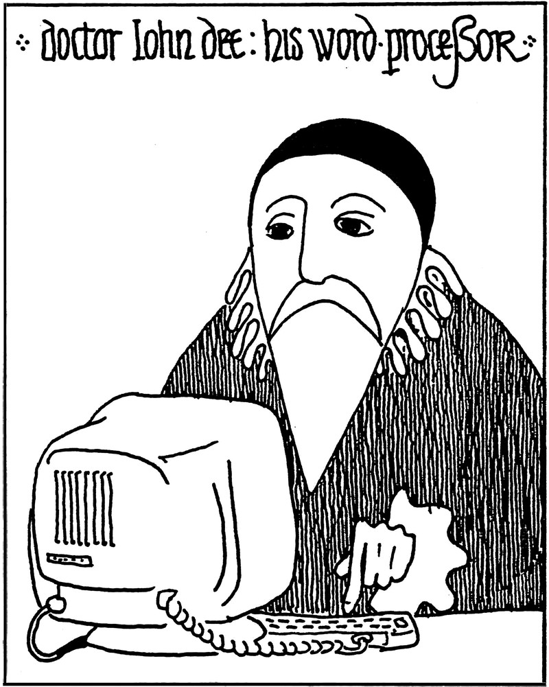 Our ninth cousin, John Dee, and his word processor.  From Magonia, no. 33.
