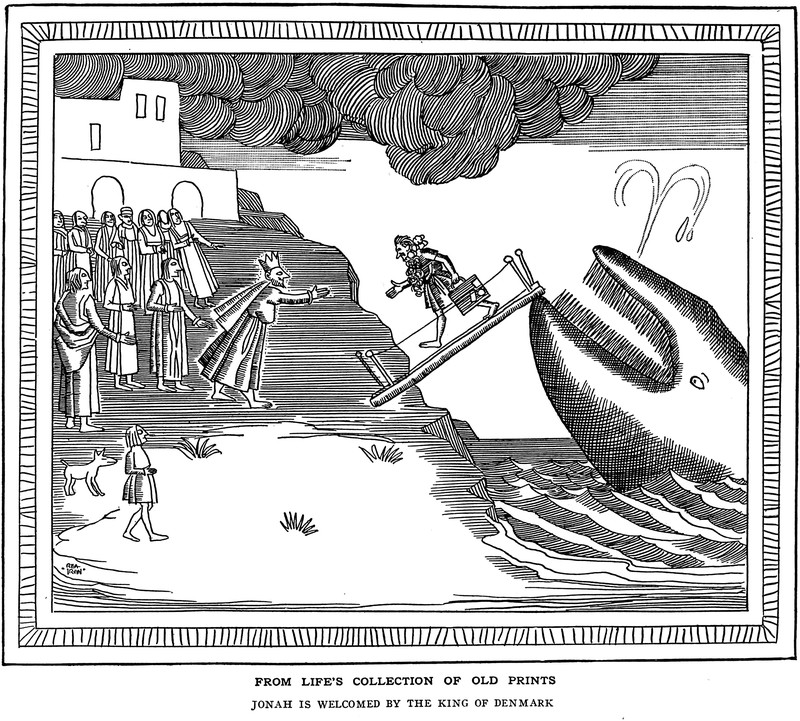 "Maybe the whale had stomach-ache.  Preacher says Jonah's leviathan had the indigestion."  From the Duluth Herald, 1911.