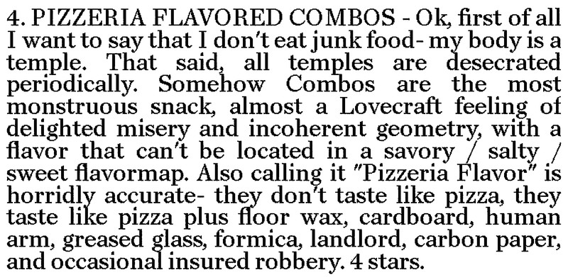 A fascinating description of a peculiar snack food flavor, from a great Top Ten list with only eight items, in Monsters News, 2012.