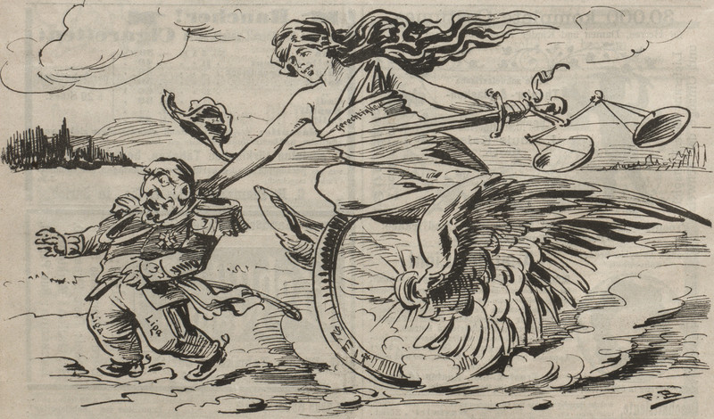 The winged wheel of Justice.  From Nebelspalter, 1899.