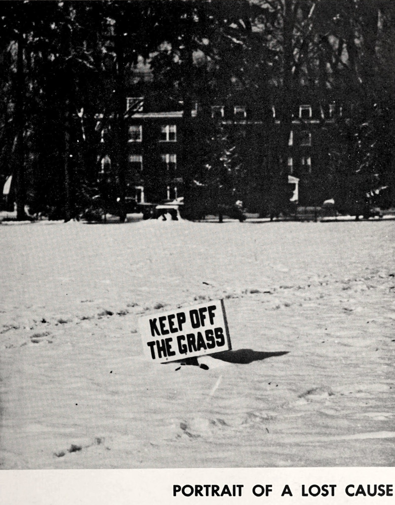 #vintage photo #snow #winter #vintage yearbook #yearbook #sign #1950s #keep off the grass