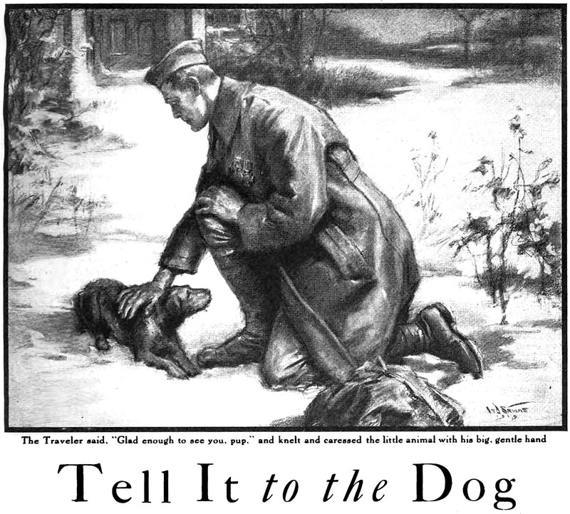 "Tell It to the Dog. The Traveler said, 'Glad enough to see you, pup,' and knelt and caressed the little animal with his big, gentle hand." From Cosmopolitan (1919).