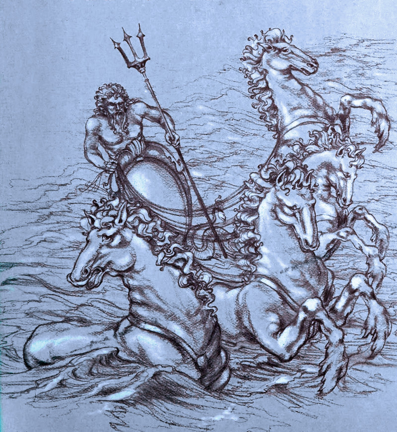 Answers: Rotate the image counter-clockwise and look for bearded King Neptune and his trident in the space between the tree and the hillside. The smaller mermaid's face is in the water touching the shoreline, below left of the shell.