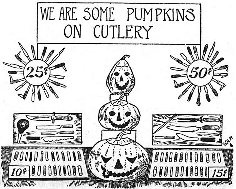 Just as the goddess Diana showed that the hunter and the stag are one, this vintage window display shows that the pumpkin and the knife are one in the jack-o'-lantern. From One Hundred Easy Window Trims, 1913.
