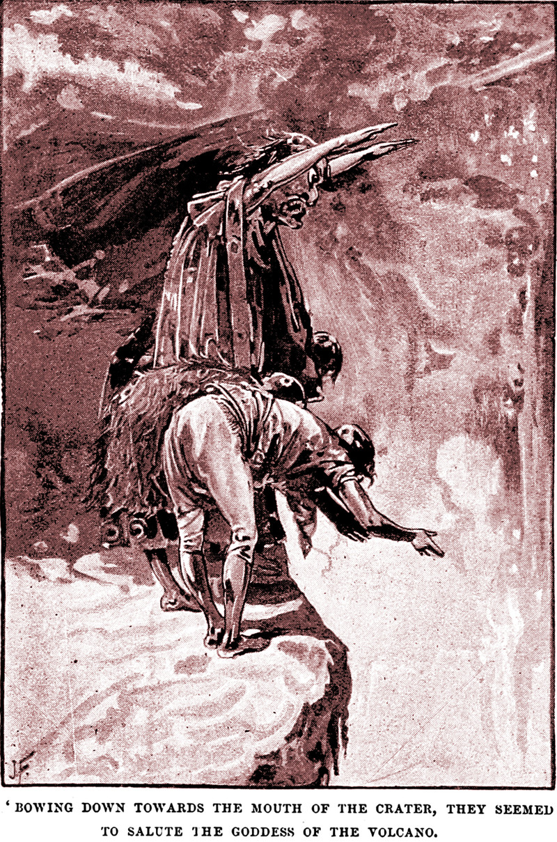 "Bowing down towards the mouth of the crater, they seemed to salute the goddess of the volcano," from The White Man's Foot by Grant Allen and illustrated by Joseph Finnemore, 1888.