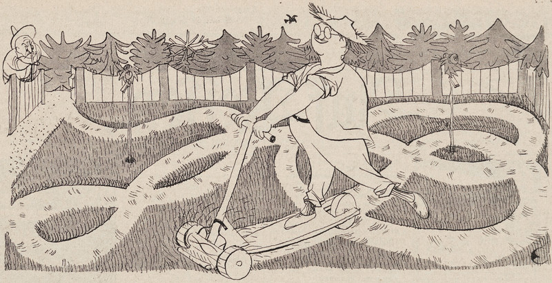 #vintage illustration #1930s #illustration #lawn mower #skateboard #mowing