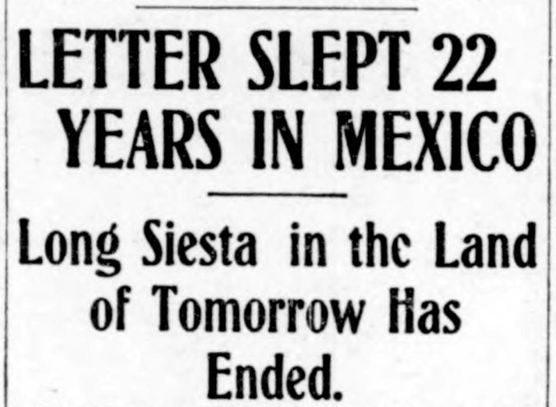 "Letter slept 22 years in Mesico.  Long siesta in the Land of Tomorrow has ended."  From the Duluth Herald, 1906.