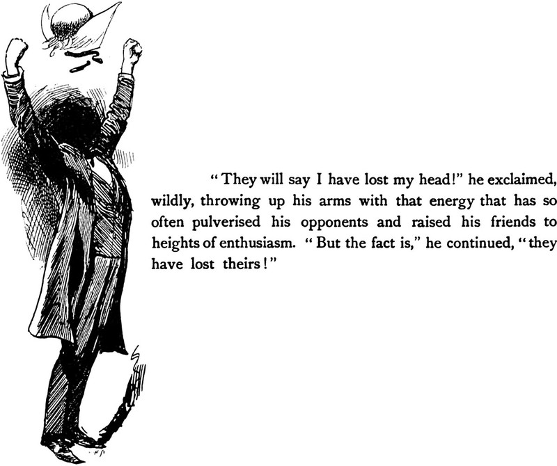 The Grand Old Mystery Unravelled by Anonymous, illustration by Harry Furniss (1894). The caption reads: "'They will say I have lost my head!' he exclaimed, wildly, throwing up his arms with that energy that has so often pulverised his opponents and raised his friends to heights of enthusiasm. 'But the fact is,' he continued, 'they have lost theirs!'"