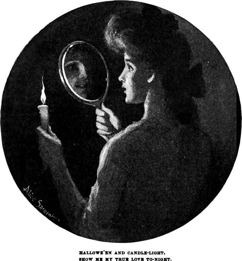 An illustration from a 1903 issue of Life magazine. The caption reads: "Hallowe'en and candle-light. Show me my true love to-night."