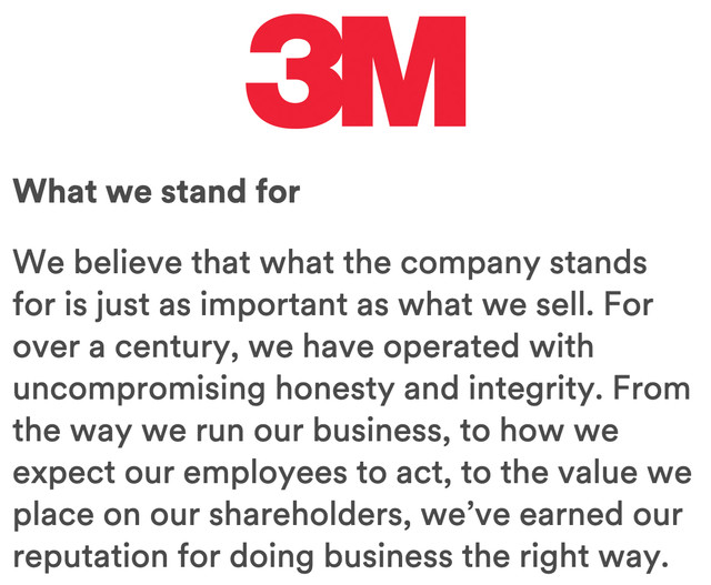 You've heard of the multinational conglomerate 3M, but what does it stand for? Monsters, Myths and Mermaids? Men, Martians and Machines? Mildew, Mudpies and Miracles? Weirdly, it's none of those things! 3M says it stands for honesty and integrity. Rather cheeky, though, not to have a single M word in their "What we stand for" section. One recalls the classic moment in The IT Crowd when Jen Barber can't say what I.T. stands for: