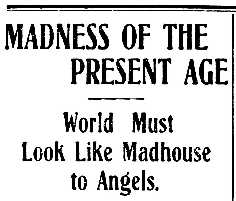 "Madness of the present age.  World must look like madhouse to angels."  From the Duluth Evening Herald, 1908.
