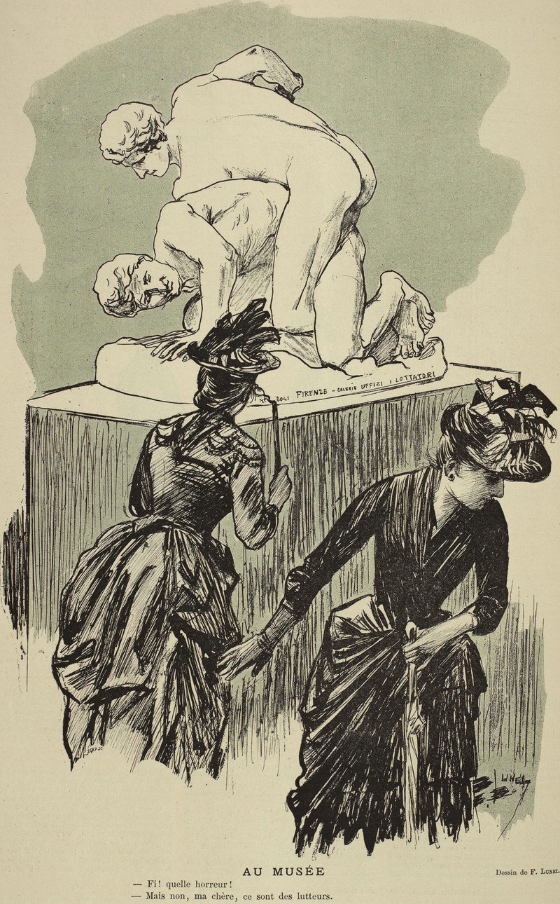They're merely wrestling.  From Le Courrier Français, 1889.