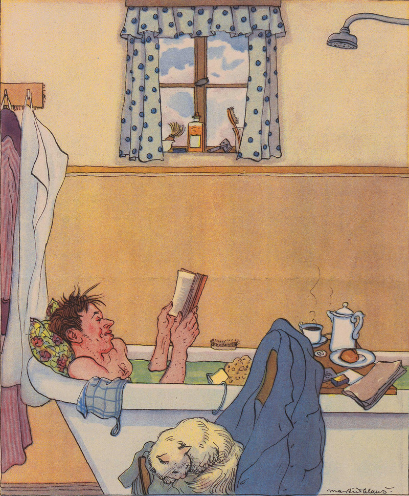 #vintage illustration #illustration #man bathing #bathtub #reading in the tub #man in a tub