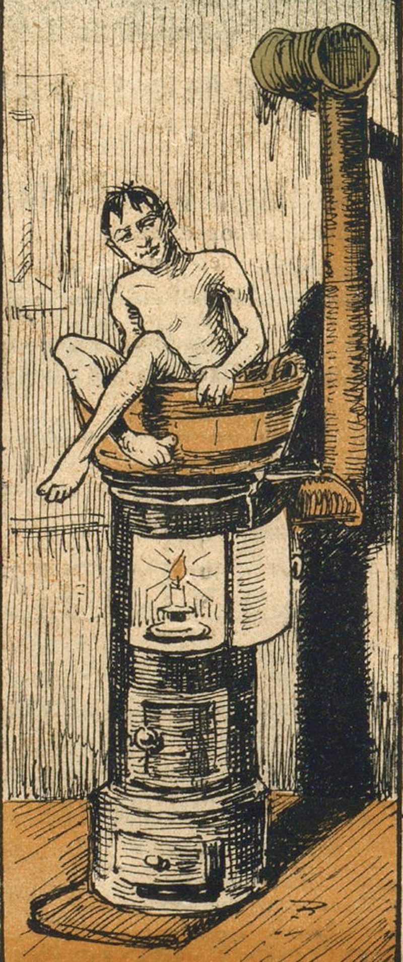 #vintage illustration #candle #man bathing #stove #tub #hot water