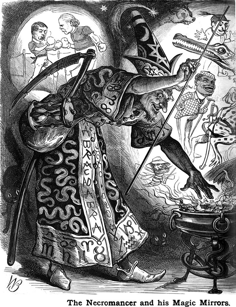 "The necromancer and his magic mirrors" -- a detail from Judy, Or The London Serio-Comic Journal, 1884.