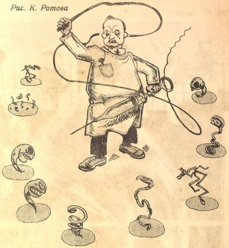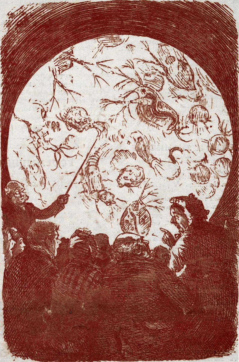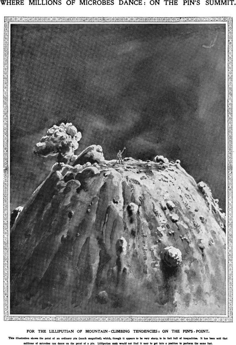 "Where millions of microbes dance: on the pin's summit. This illustration shows the point of an ordinary pin (much magnified), which, though it appears to be very sharp, is in fact full of inequalties. It has been said millions of microbes can dance on the point of a pin. Lilliputian man would not find it easy to get into a position to perform the same feat." From The Sketch, 1910.