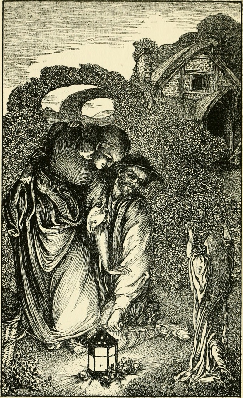 This miniature lady is the Luck of the Roses, who perishes before the last of the roses dies, taken by the chills of the night and killed by the first frost.  From The House of Joy by Laurence Housman, 1895.
